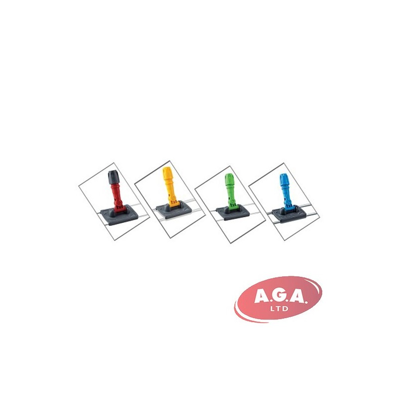 Metāla turētājs ar dubultās plastmasas vidus daļu un kāta stiprinājumu, piemērots 80 cm mopam ar kantainām kabatām. Dažādās krāsās. Savienojams ar mop-sistēmas kātiem